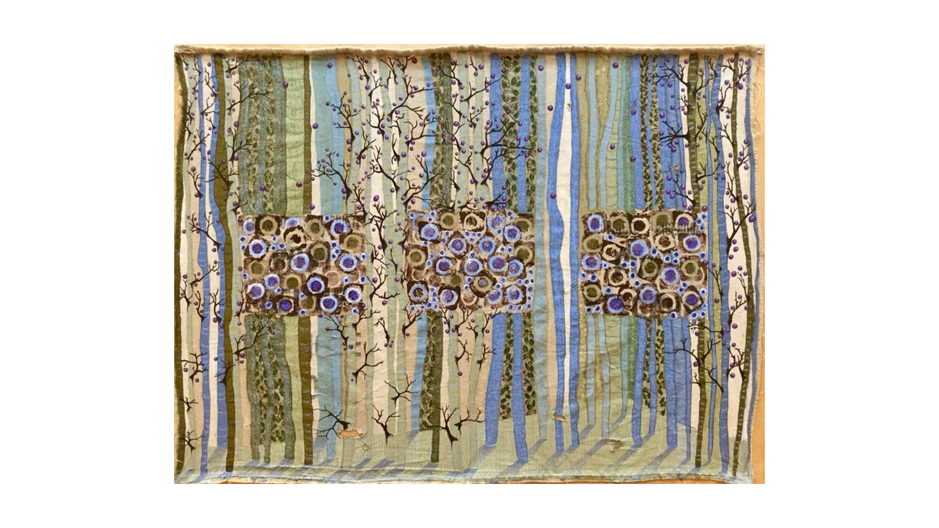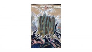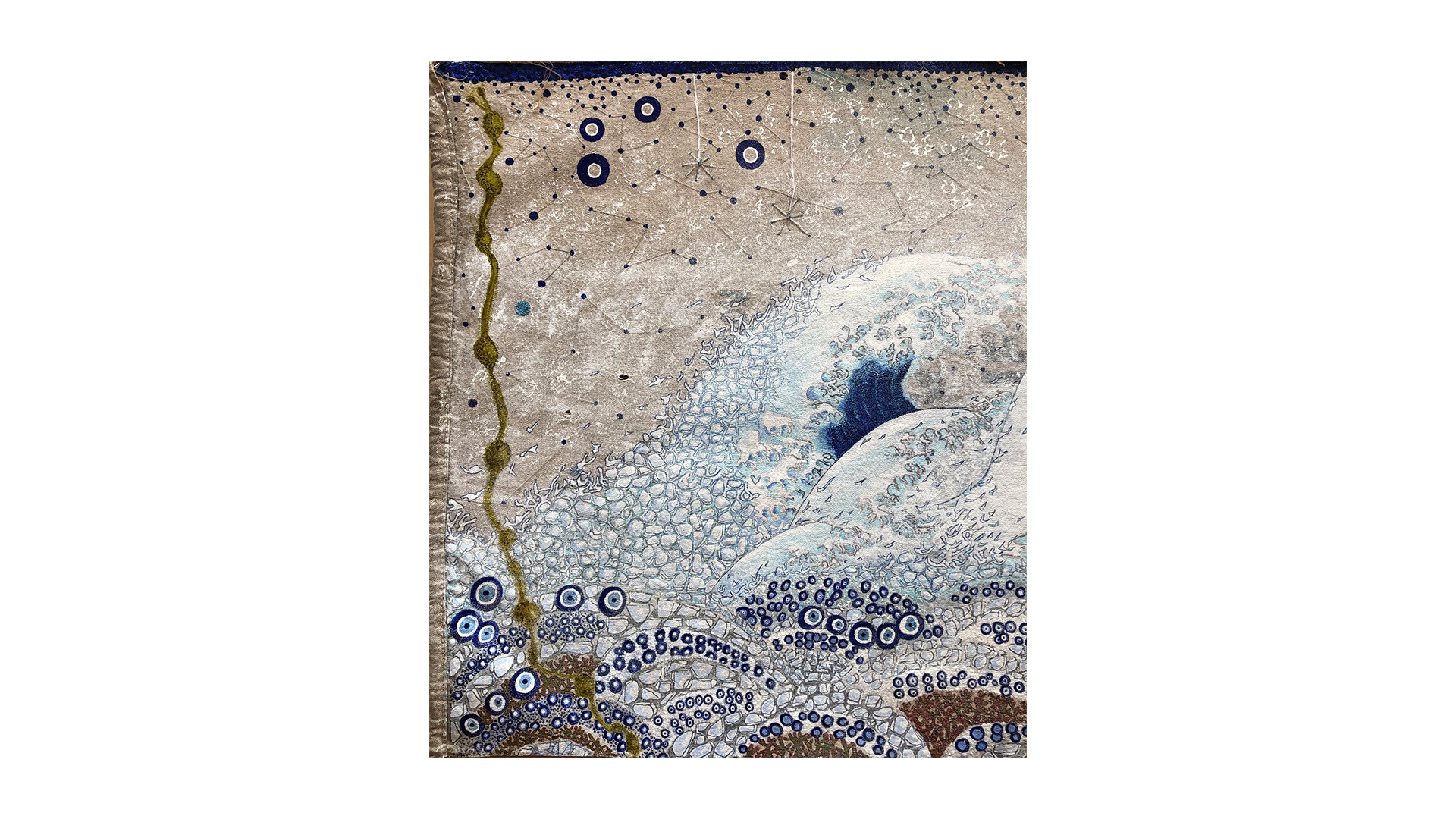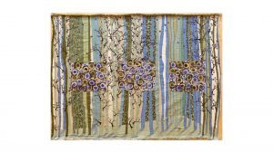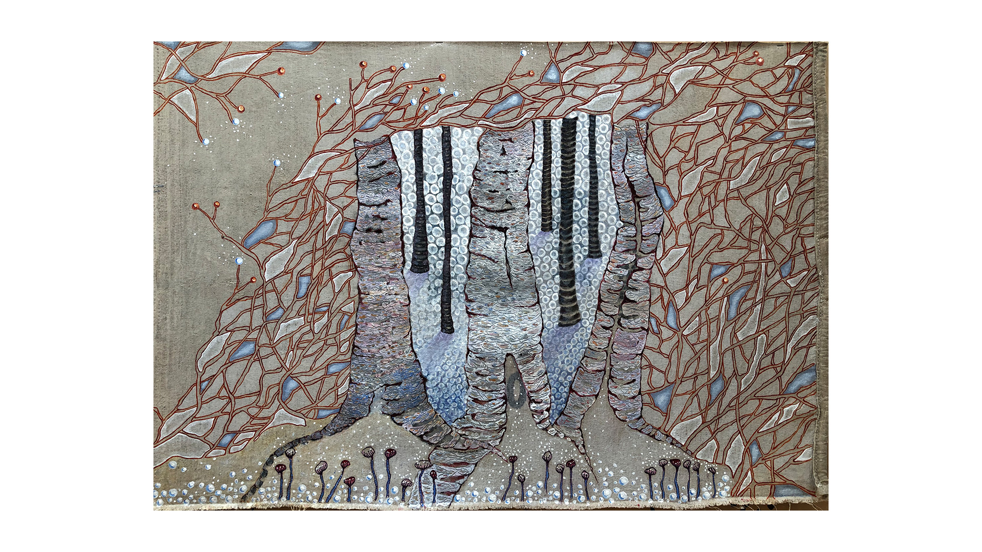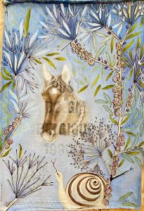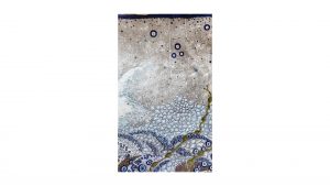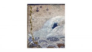 The series presented here is quite particular as it has been part of a cycle of paintings on the theme of nature for the last twenty years, combining painting and embroidery techniques. The medium is careful selection of original postal bags that hold together a historical, sentimental and social significance. Historically, for over 22 years most bags like the ones as seen exhibited here have disappeared from circulation all together and are now part of our cultural memory. Sentimentally, the bags were the only means of transporting our secrets. Carrying messages from heaven to hell via purgatory. Socially, since then our society has switched to new and increasingly sophisticated technologies where mail today is transformed into @ and no longer needs bags. After several months of demanding and high-precision work which consisted the needle to pierce through fabric that is stiff, recalcitrant, rigid, rough, dirty, damaged and often perforated these same bags were transformed into precious, delicate objects while silver and/or silk thread were added creating a shimmering quality to the fabric. The techniques used are embroidery, sewing, pigment, oil, pastels etc. These postal bags are transformed from utilitarian objects into precious objects where finesse and frailness are expressed.