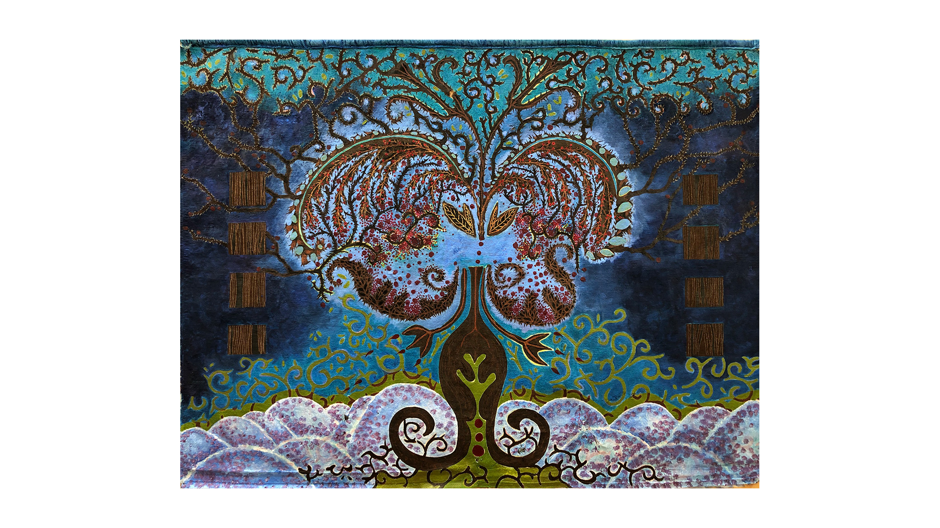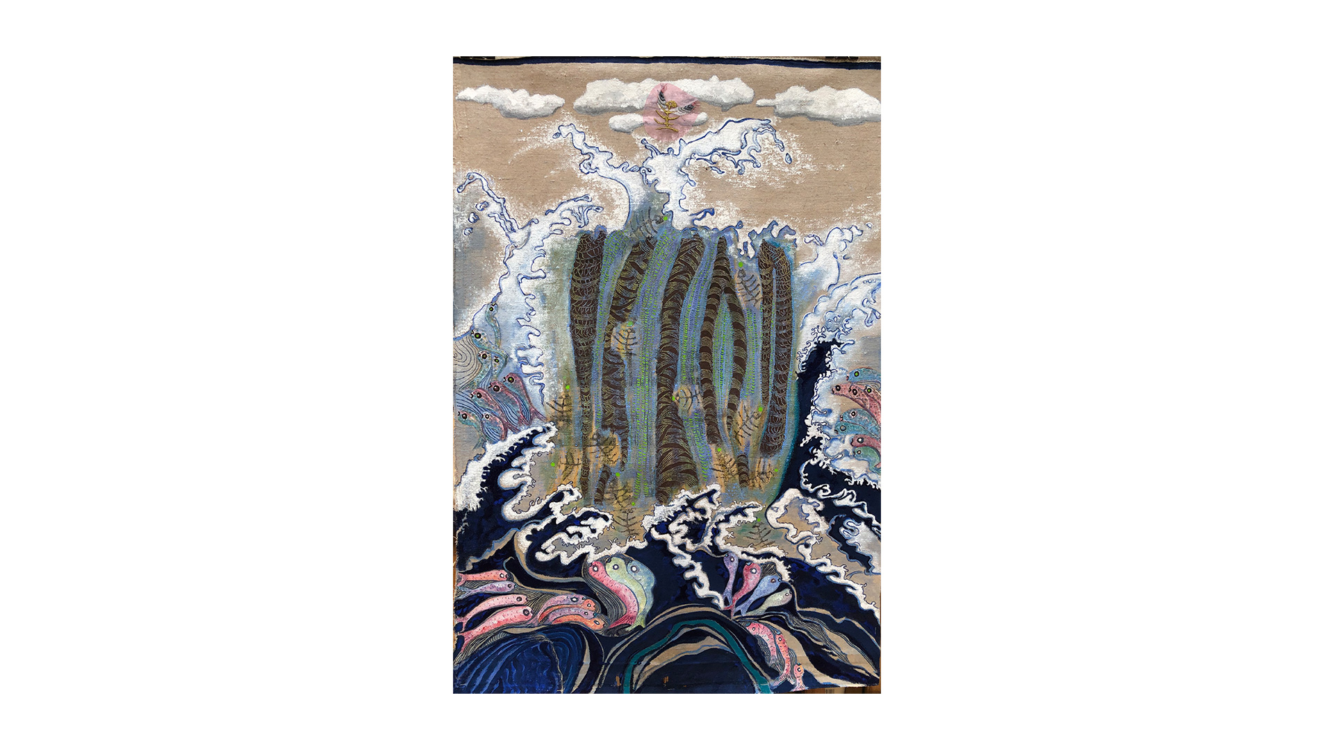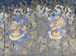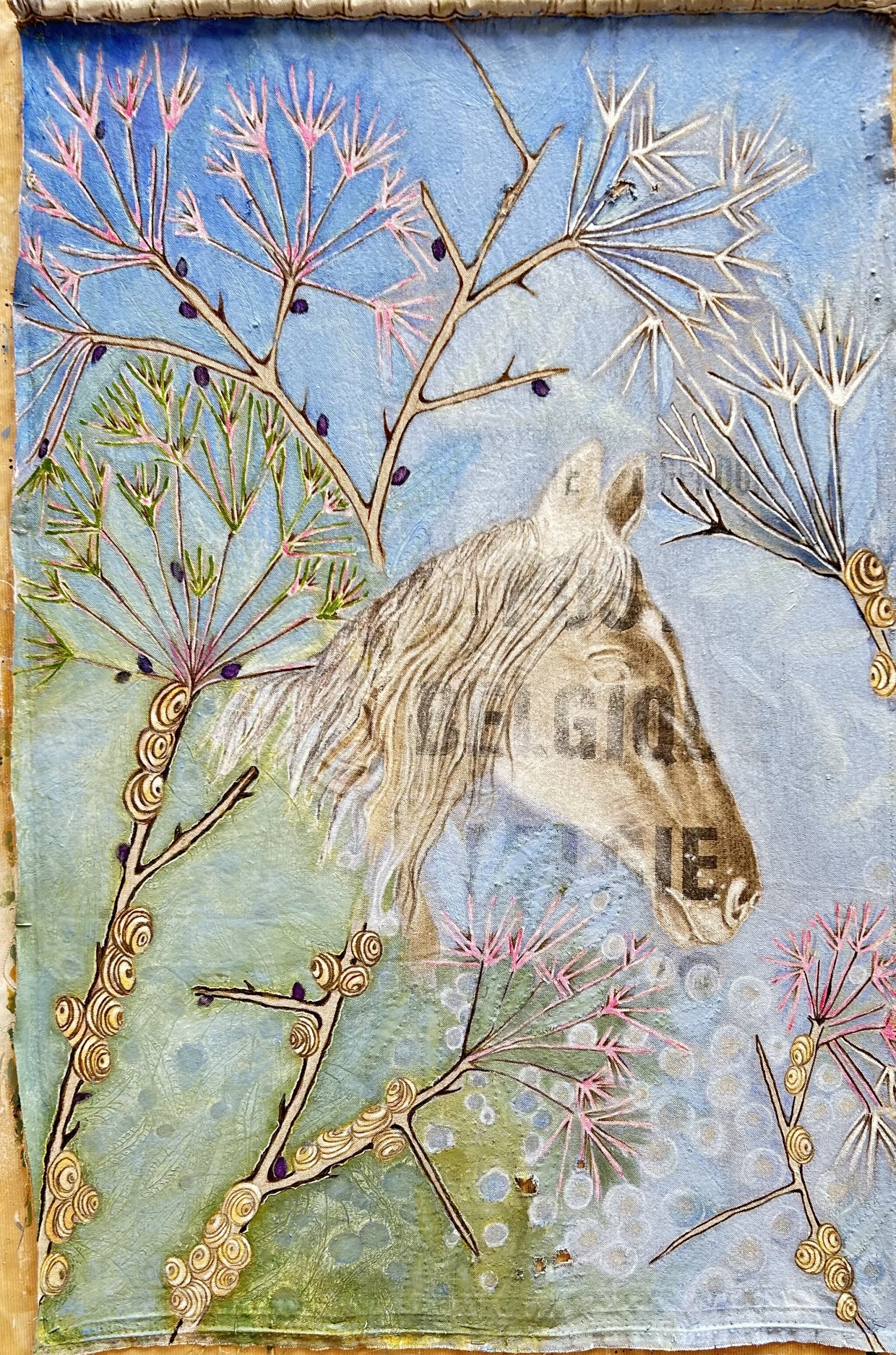 The series presented here is quite particular as it has been part of a cycle of paintings on the theme of nature for the last twenty years, combining painting and embroidery techniques. The medium is careful selection of original postal bags that hold together a historical, sentimental and social significance. Historically, for over 22 years most bags like the ones as seen exhibited here have disappeared from circulation all together and are now part of our cultural memory. Sentimentally, the bags were the only means of transporting our secrets. Carrying messages from heaven to hell via purgatory. Socially, since then our society has switched to new and increasingly sophisticated technologies where mail today is transformed into @ and no longer needs bags. After several months of demanding and high-precision work which consisted the needle to pierce through fabric that is stiff, recalcitrant, rigid, rough, dirty, damaged and often perforated these same bags were transformed into precious, delicate objects while silver and/or silk thread were added creating a shimmering quality to the fabric. The techniques used are embroidery, sewing, pigment, oil, pastels etc. These postal bags are transformed from utilitarian objects into precious objects where finesse and frailness are expressed.